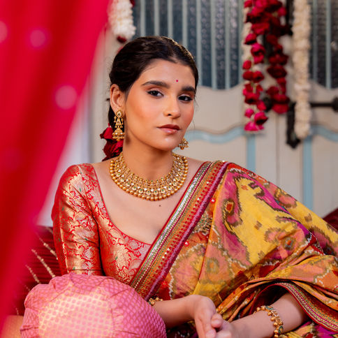 A tissue Patola saree with aari tikki work which is highlight the motif and its a fusion of heritage weaving and contemporary festive elegance. Here’s a rich, brand-ready description you can use