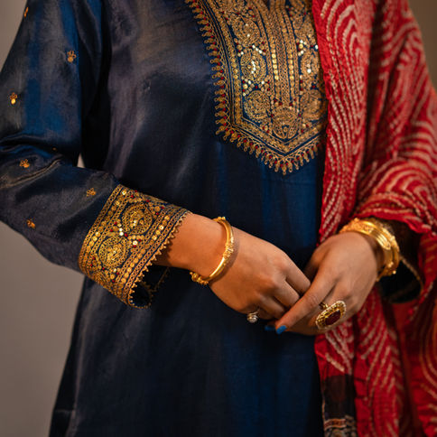This Gaji silk kurta-pant set blends luxury and tradition, featuring intricate aari-tikki embroidery and a lustrous silk fabric for an elegant look, The flexible fit of the pants ensures both comfort and sophistication. Perfect for special occasions, this ensemble offers timeless appeal and is sure to make a lasting impression