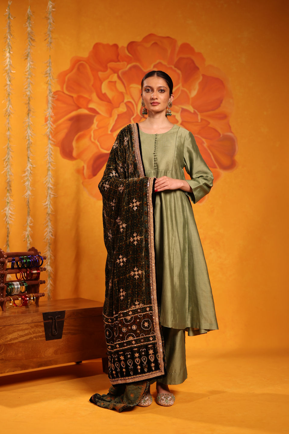 This Chanderi silk kurta-pant set blends luxury and tradition, featuring intricate detailing and a lustrous silk fabric for an elegant look, The refined fit of the pants ensures both comfort and sophistication. Perfect for special occasions, this ensemble offers timeless appeal and is sure to make a lasting impression