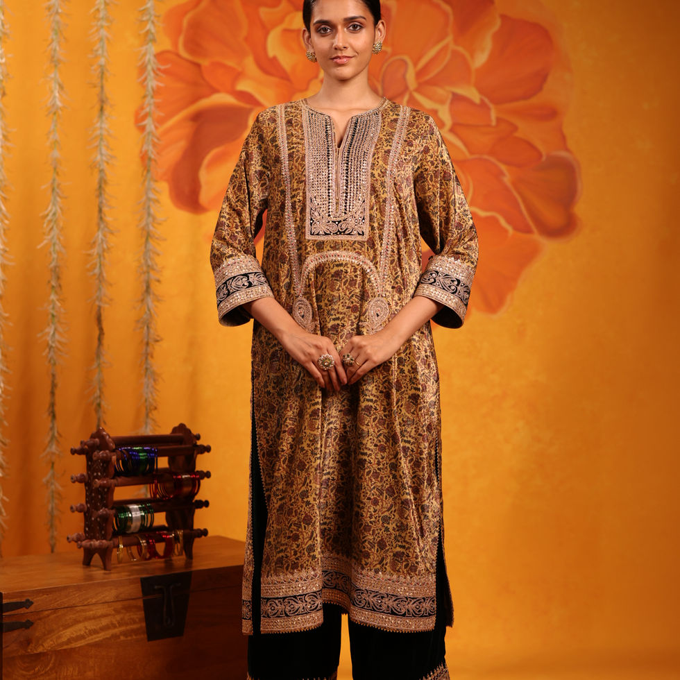 This printed velvet kurta-pant set combines luxurious velvet fabric with intricate marodi embroidery, creating a stunning blend of texture and elegance. The rich print adds a vibrant touch, while the detailed embroidery enhances the overall design with its traditional charm. Perfect for special occasions, this ensemble offers a sophisticated, yet contemporary look that stands out with its opulence and craftsmanship
