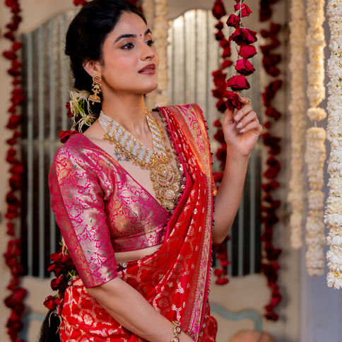 Woven in the historic city of Varanasi, the Banarasi saree is known for its rich silk base, intricate zari motifs, and drape. When enhanced with Marodi work—a meticulous hand embroidery technique which is make it luxurious.