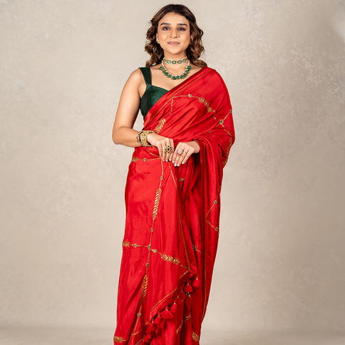 A stunning saree made of organic silk, adorned with intricate aari tikki embroidery that adds delicate, handcrafted charm. The natural sheen of the silk beautifully complements the detailed patterns, creating an elegant and refined look. Ideal for weddings and festive occasions, it blends tradition with graceful sophistication.