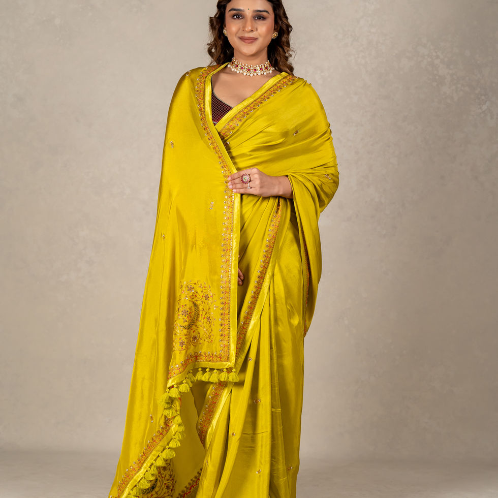 A stunning saree made of organic silk, adorned with intricate aari tikki embroidery that adds delicate, handcrafted charm. The natural sheen of the silk beautifully complements the detailed patterns, creating an elegant and refined look. Ideal for weddings and festive occasions, it blends tradition with graceful sophistication.