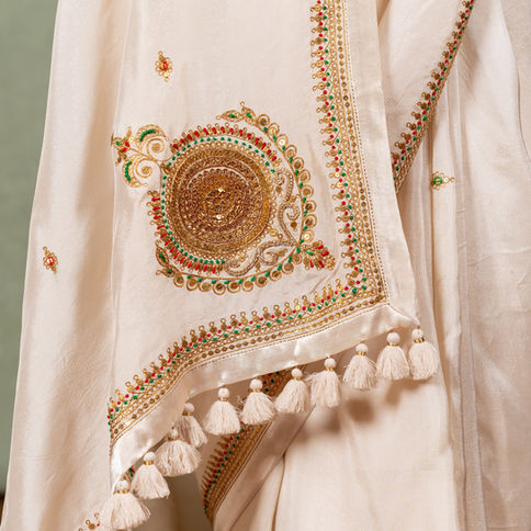 A stunning saree made of organic silk, adorned with intricate aari tikki embroidery that adds delicate, handcrafted charm. The natural sheen of the silk beautifully complements the detailed patterns, creating an elegant and refined look. Ideal for weddings and festive occasions, it blends tradition with graceful sophistication.