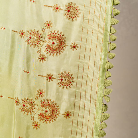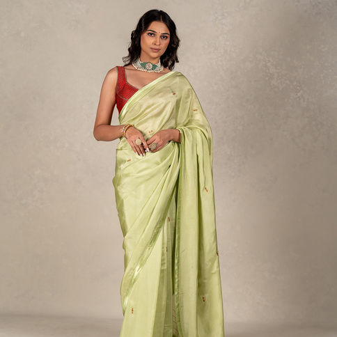 A stunning saree made of organic silk, adorned with intricate aari tikki embroidery that adds delicate, handcrafted charm. The natural sheen of the silk beautifully complements the detailed patterns, creating an elegant and refined look. Ideal for weddings and festive occasions, it blends tradition with graceful sophistication.