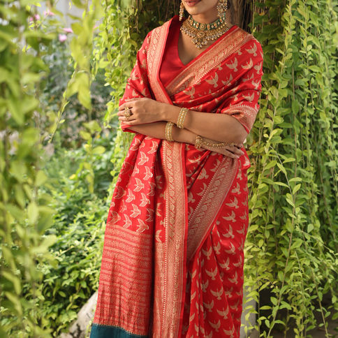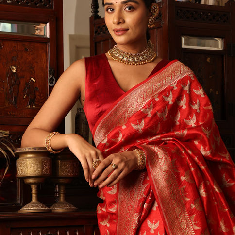 Radiant red silk saree that celebrates classic Indian grandeur with refined elegance. Adorned with gold zari bird motifs across the drape, it beautifully blends cultural richness with graceful artistry. The intricately woven traditional border and luxurious pallu enhance its regal appeal, making it a perfect choice for festive occasions, pooja ceremonies, weddings, and cherished family celebrations.