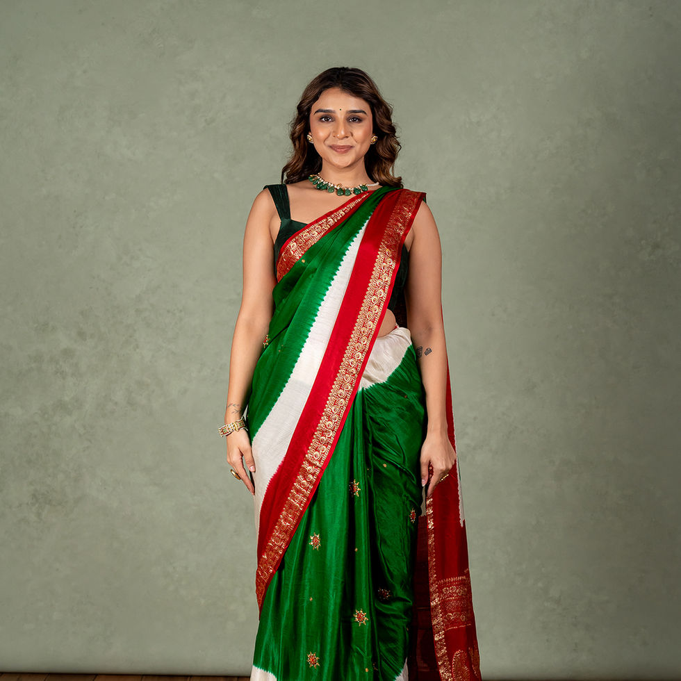 A vibrant celebration of elegance, this pure Gaji silk saree showcases a striking blend of emerald green, ivory, and deep red. The rich Banarasi border, highlighted with golden zari, lends a regal touch, while delicate Marodi embroidery enhances its traditional charm. Paired with a deep green blouse, this saree beautifully harmonizes festive grace with timeless sophistication — perfect for weddings, pujas, and special occasions.